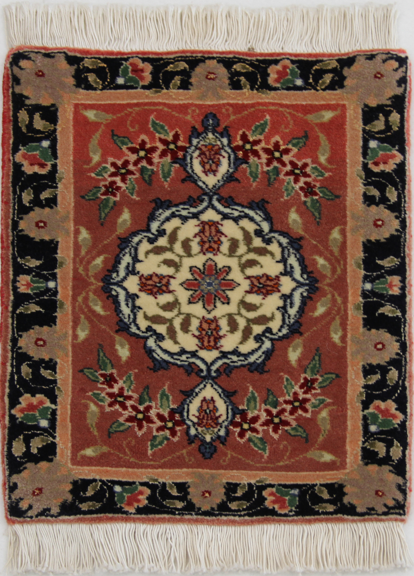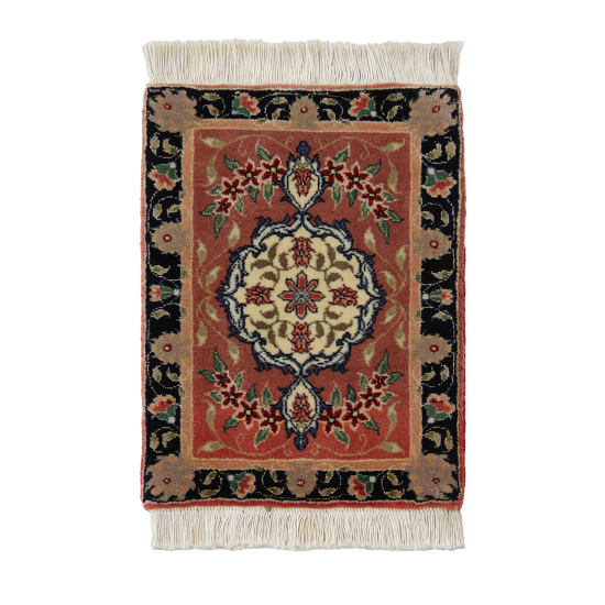 This Persian carpet was lovingly woven by artisans in Tabriz and measures 38x37cm. Despite its small size, it is a masterpiece of design and craftsmanship.