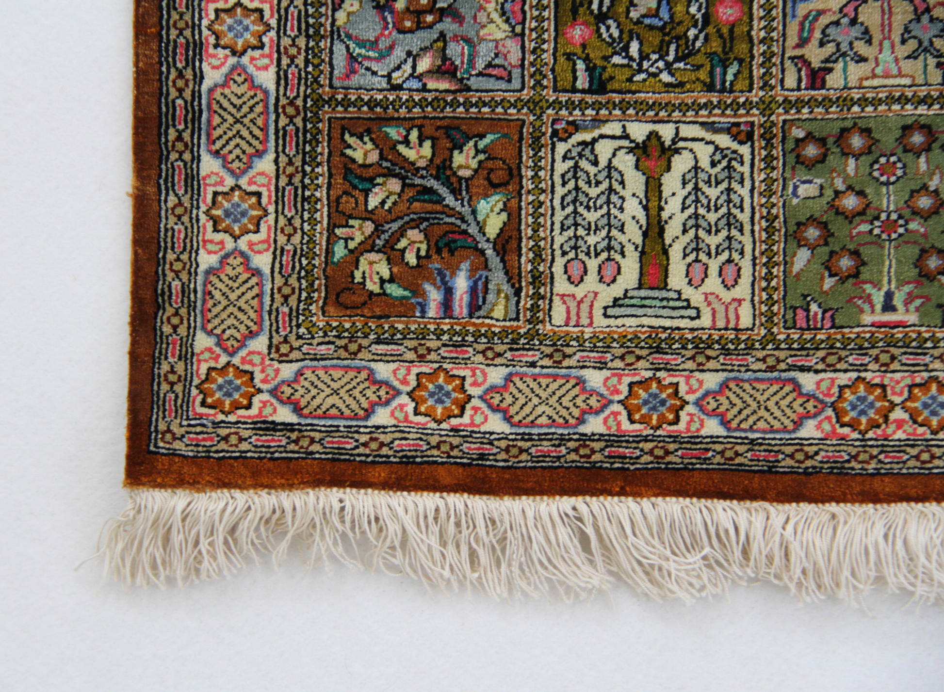 Although no density information is given, Qom silk carpets are generally very densely woven, with fine detail and durability. Woven by skilled artisans, these carpets are considered works of art.