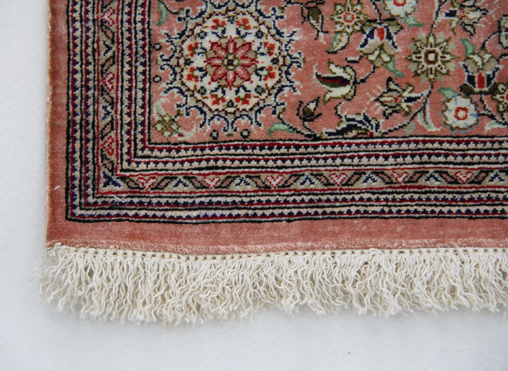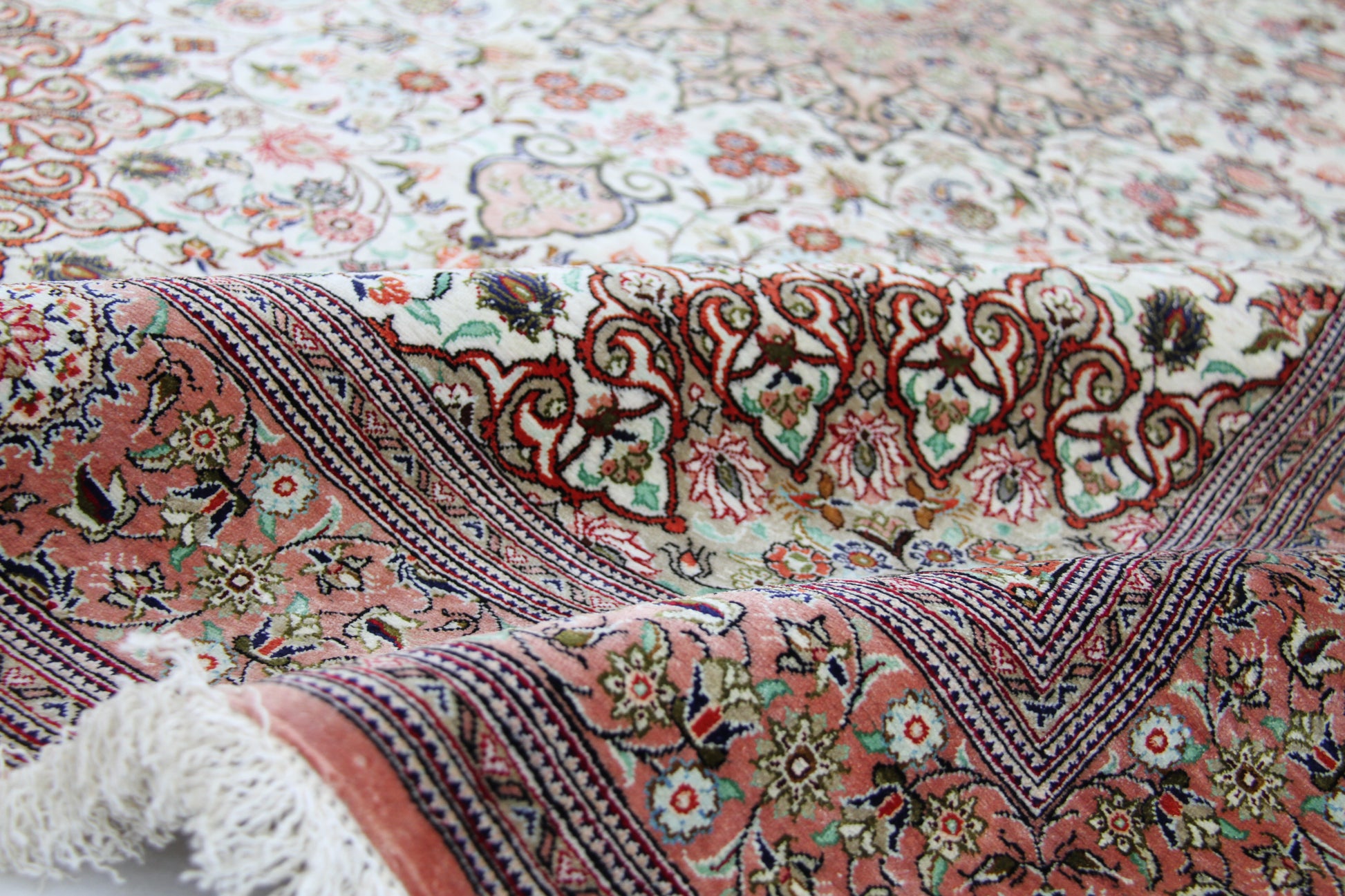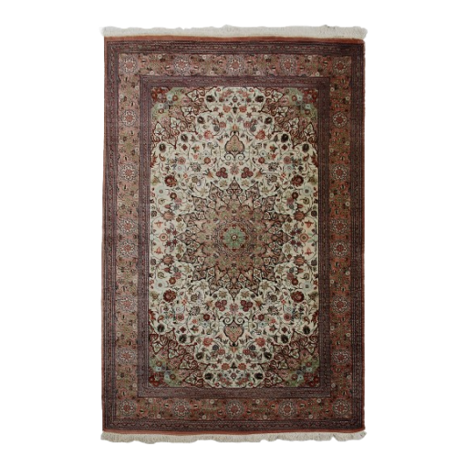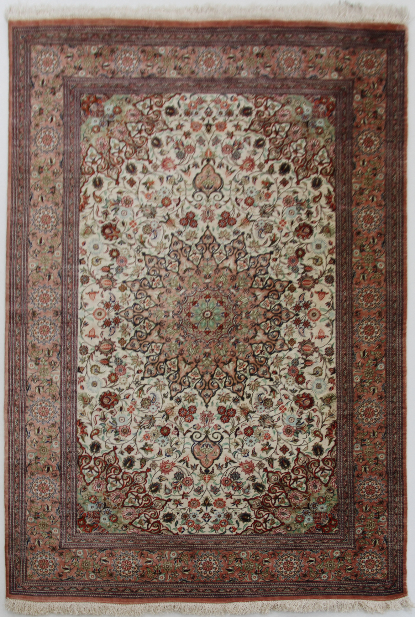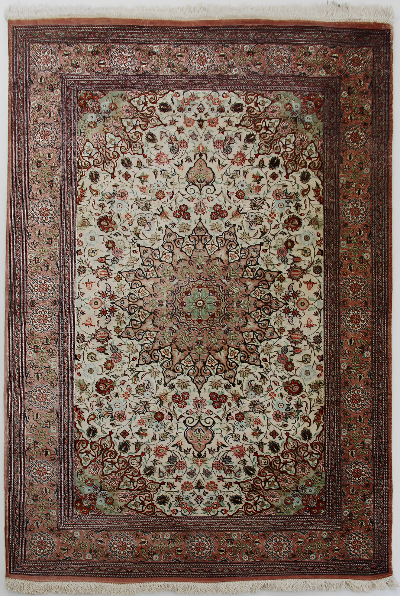 このクム産のペルシャ絨毯は、ペルシャ絨毯の中でも特に高品質で知られる一品です。細部にまでこだわった美しいメダリオンコーナーデザインが、ローズベージュの配色で優雅に仕上げられています。