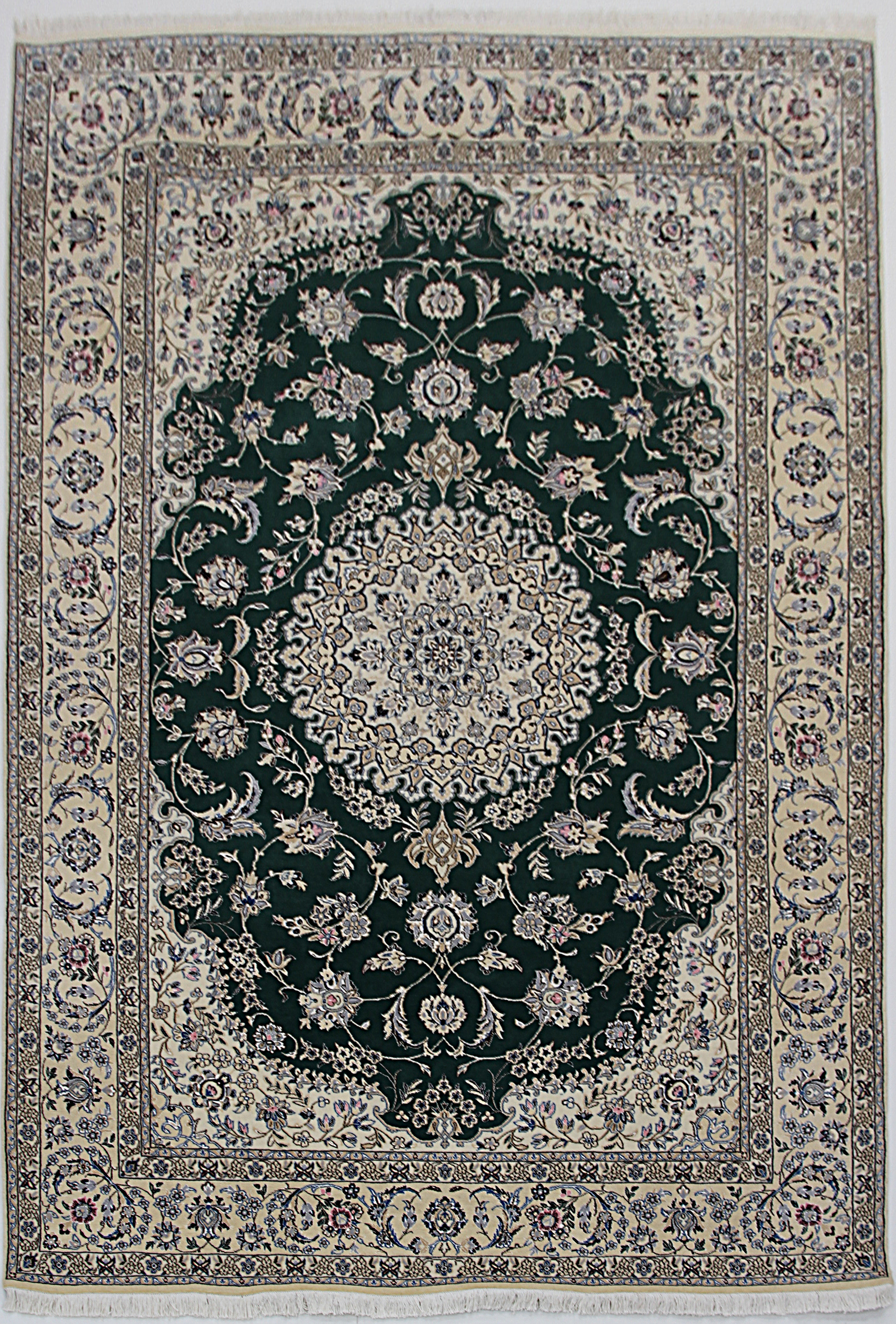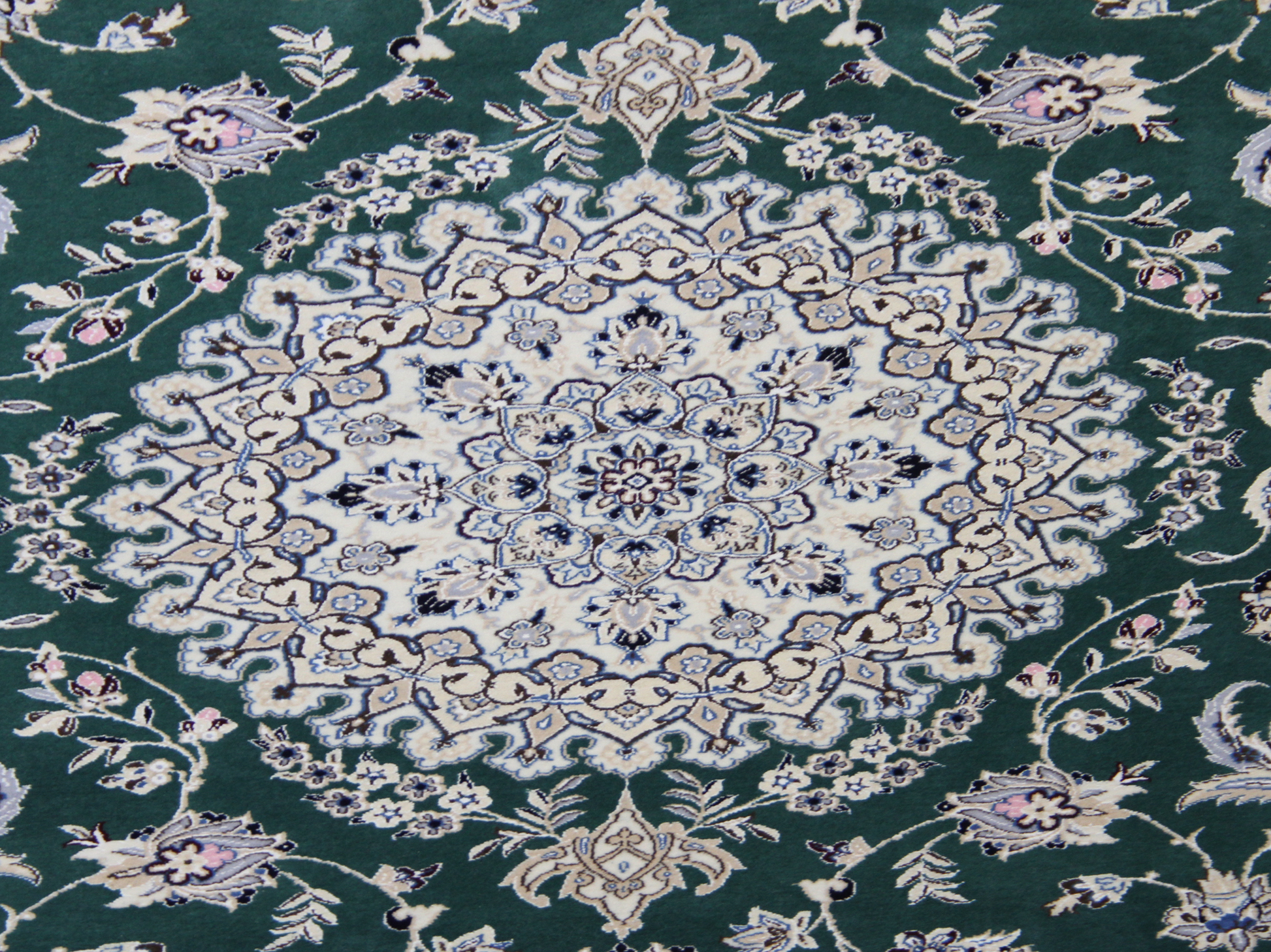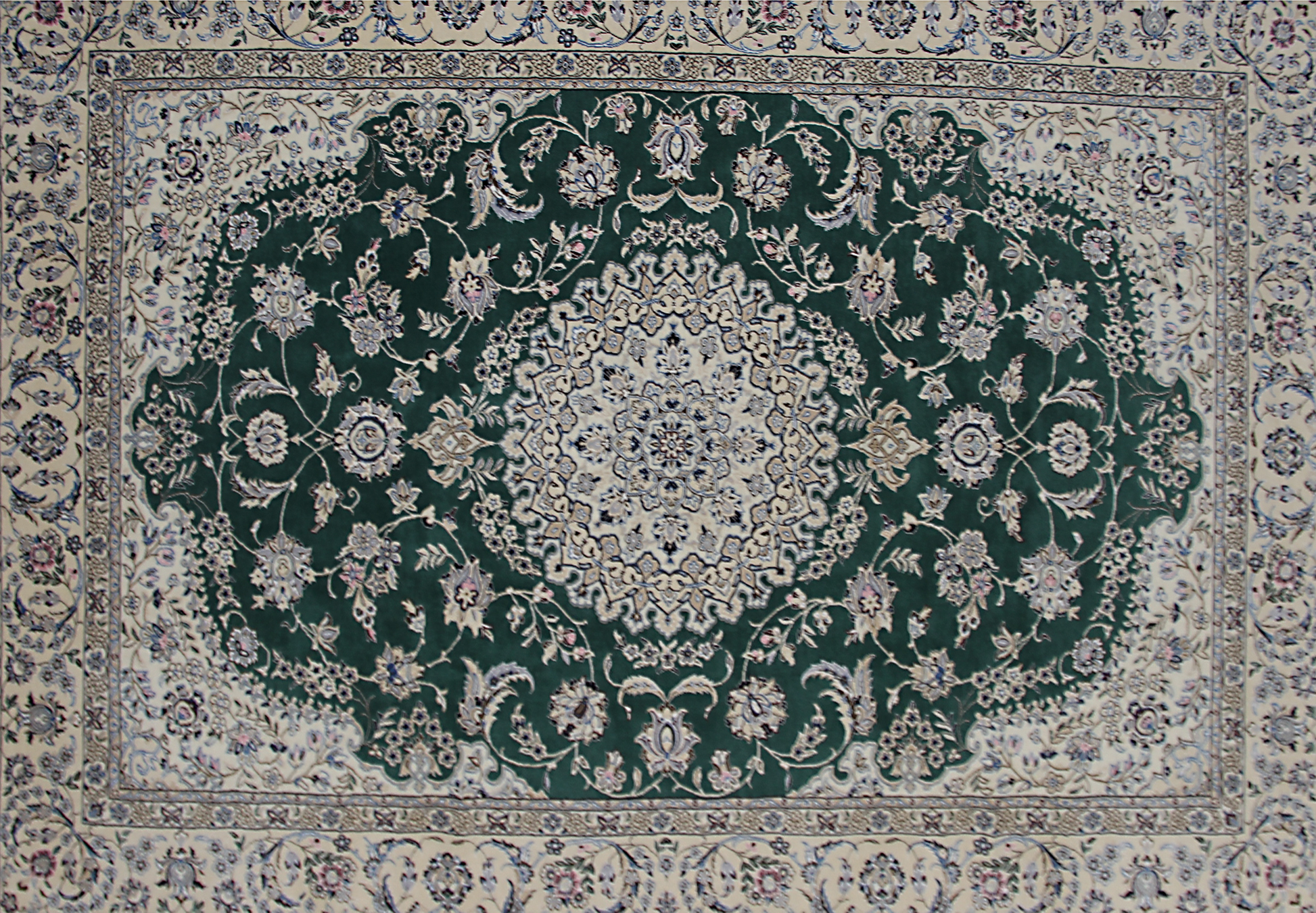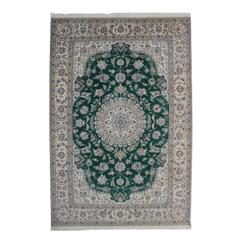 ナインの絨毯は細やかな模様と優雅な色使いが特徴です。緑の繊細な模様が視覚的に魅力的で、お部屋の中心に置くことでその美しさが際立ちます。