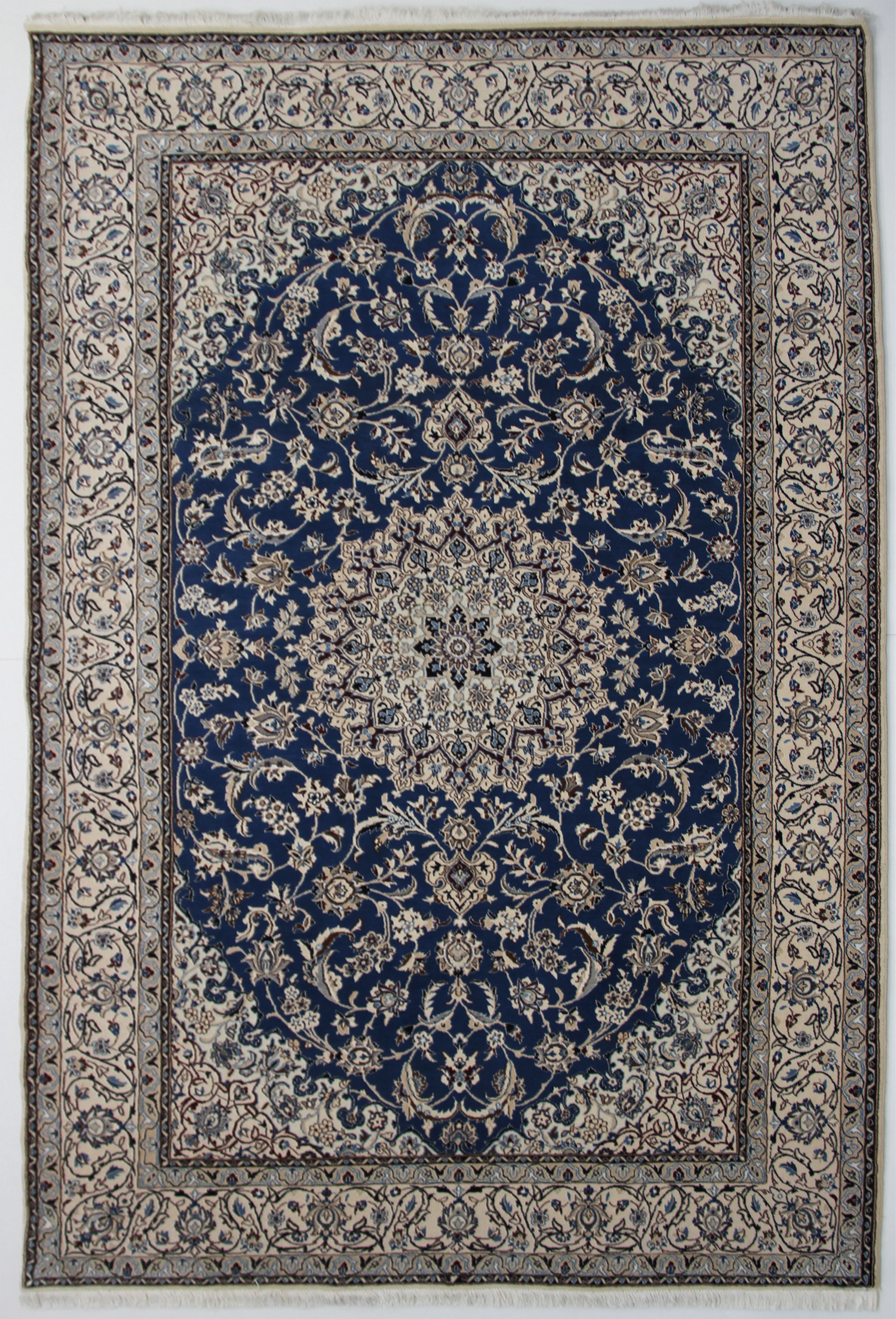 このナイン産のペルシア絨毯は、伝統的な技法で織り上げられた美しい一品です。大きめのサイズで、リビングルームやダイニングルームなど、広いスペースにアクセントを加えるのに最適です。