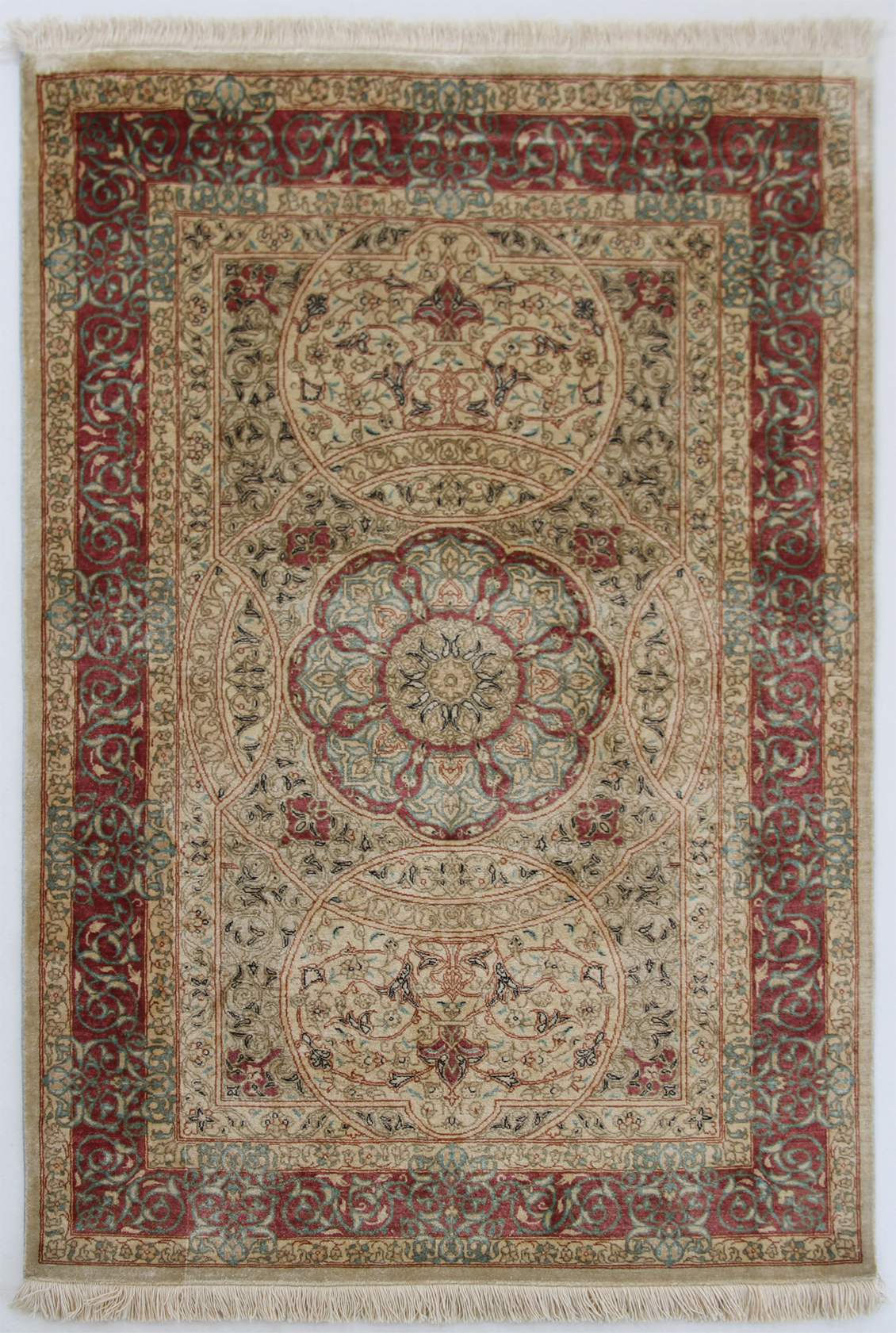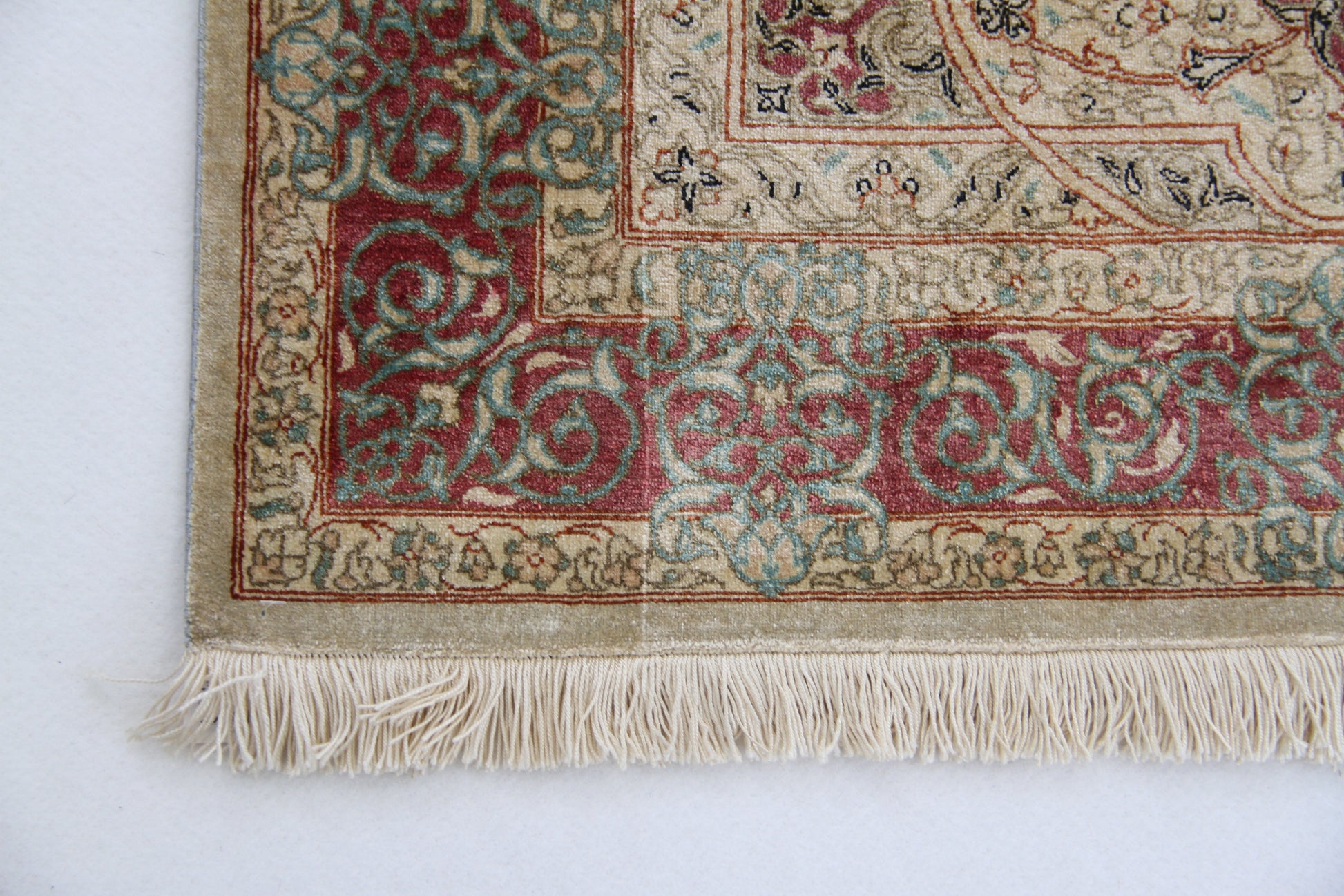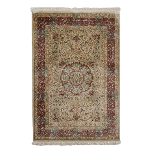 すべてのクム産ペルシア絨毯は、熟練した職人によって手織りされています。この絨毯も例外ではなく、高品質のシルクを使用して手織りされています。手作業によって生み出される繊細な織り模様が、絨毯に豊かなテクスチャーと優雅さを与えています。