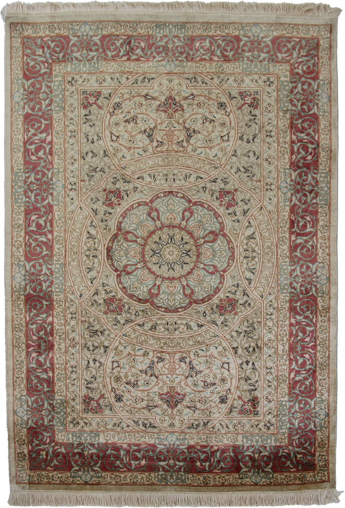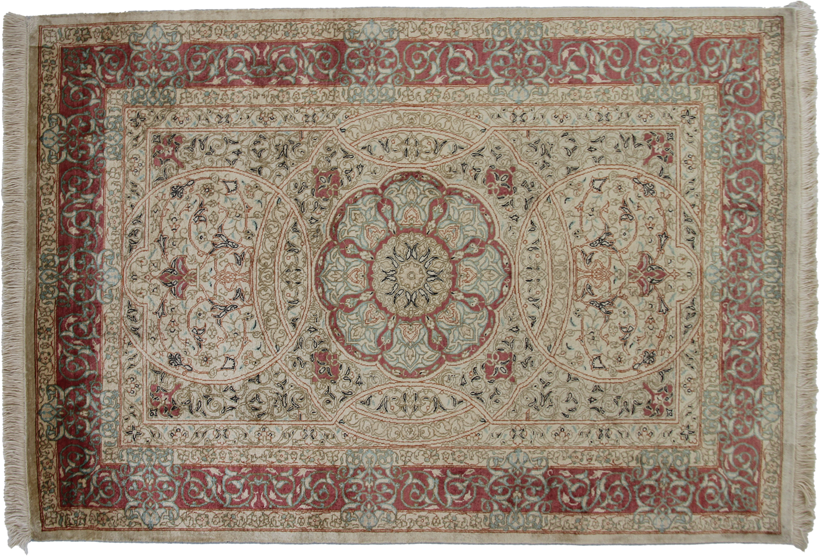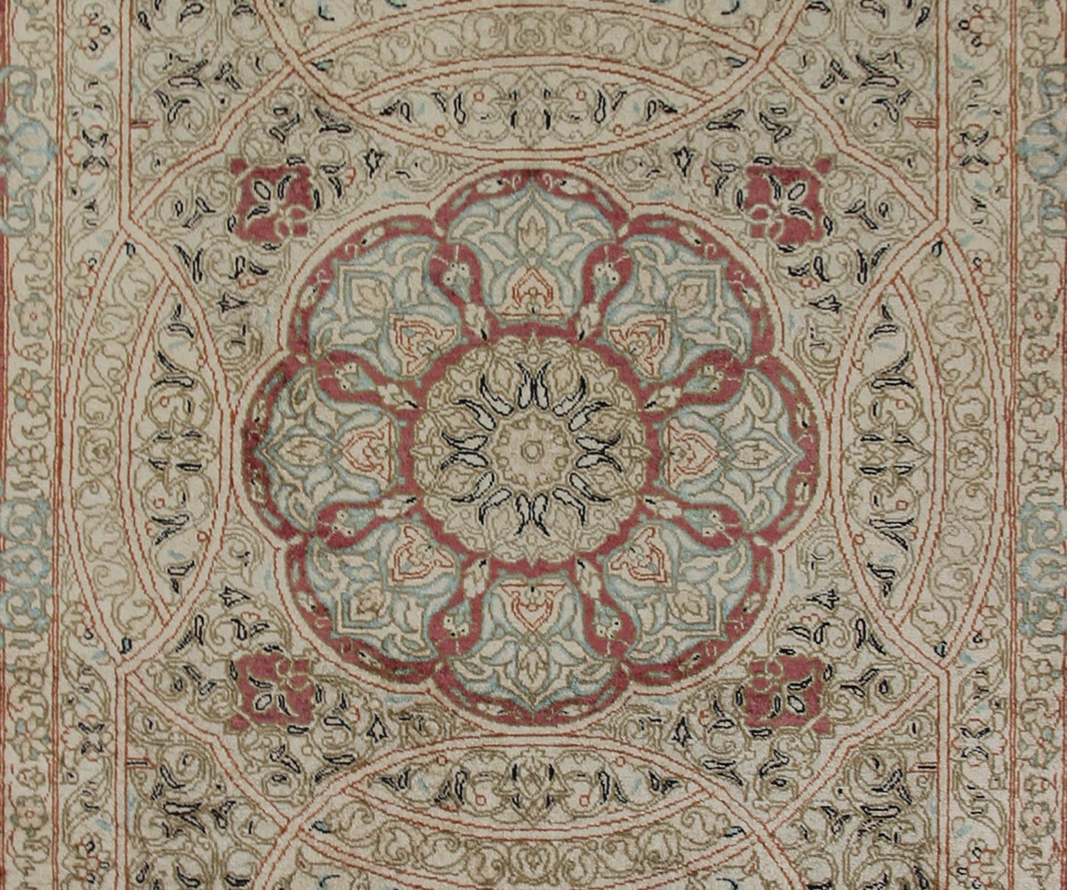 すべてのクム産ペルシア絨毯は、熟練した職人によって手織りされています。この絨毯も例外ではなく、高品質のシルクを使用して手織りされています。手作業によって生み出される繊細な織り模様が、絨毯に豊かなテクスチャーと優雅さを与えています。