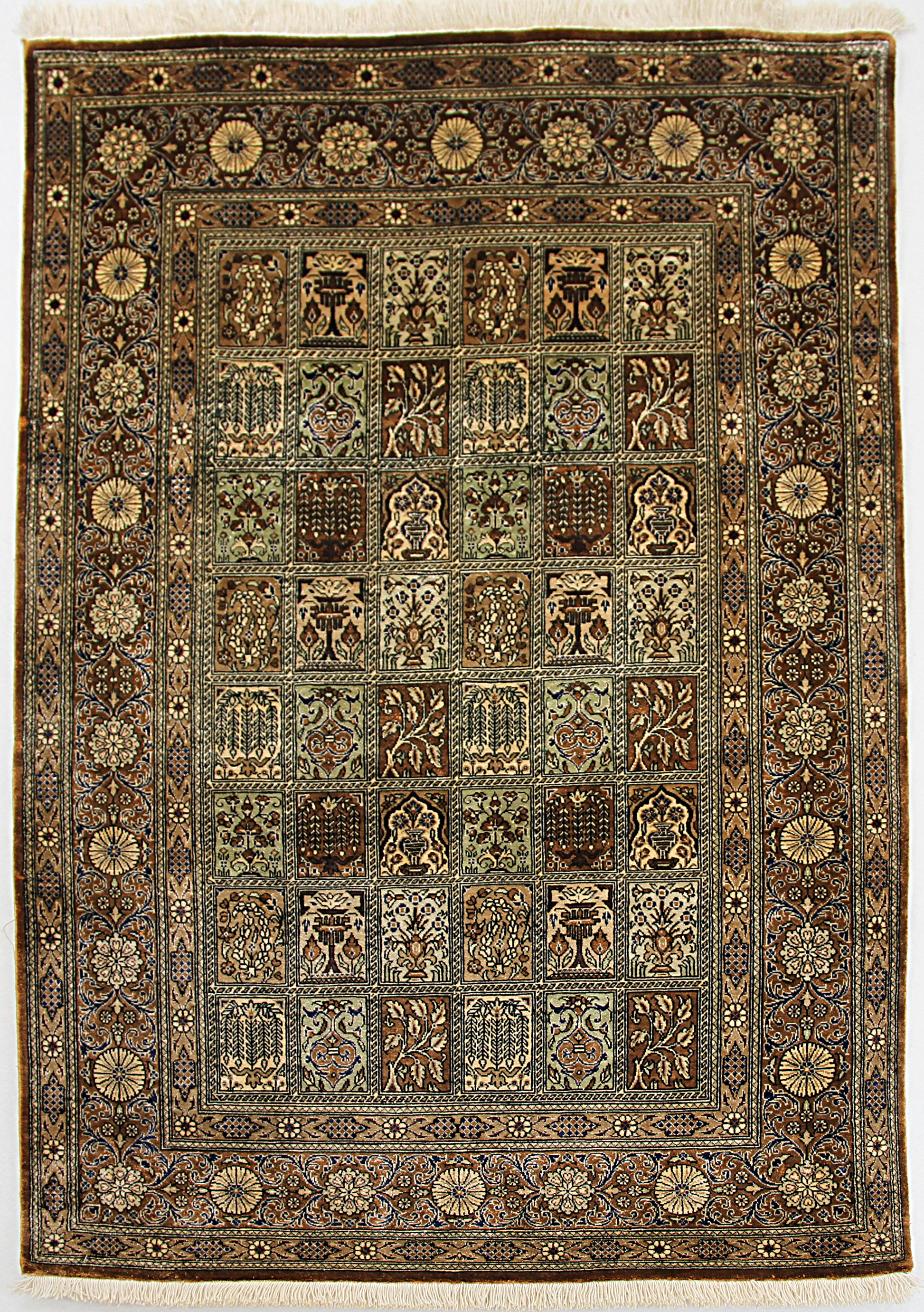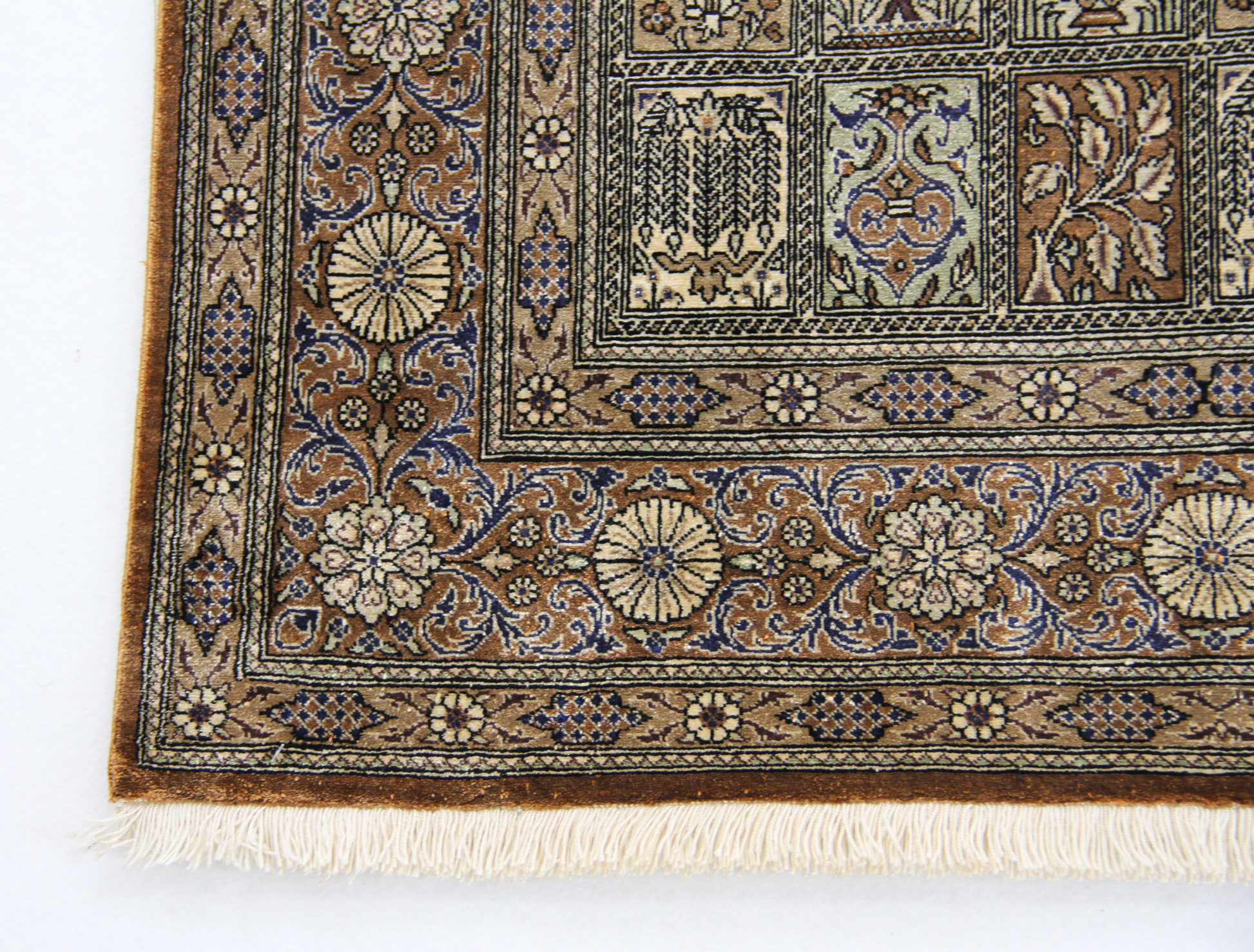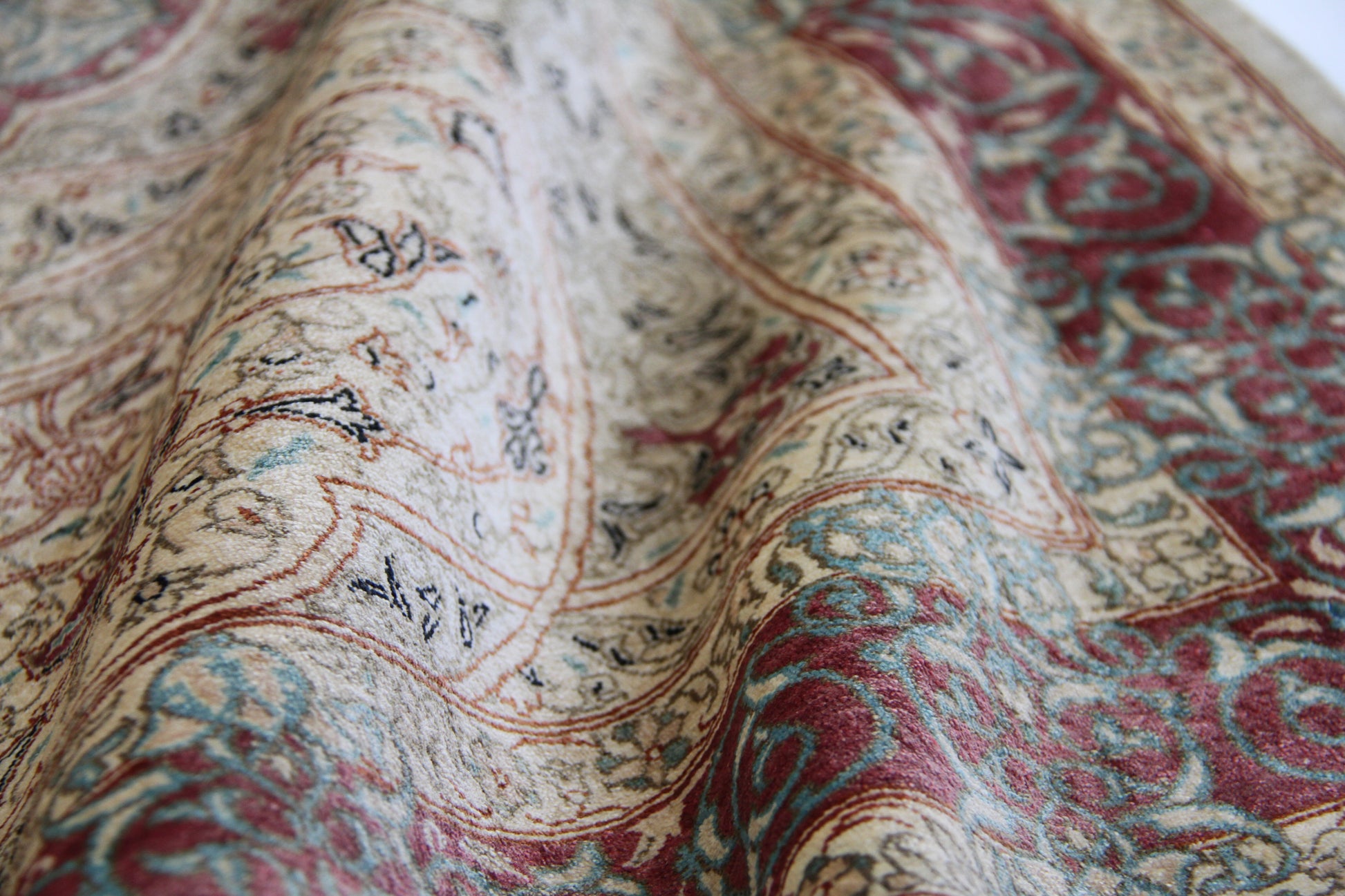 すべてのクム産ペルシア絨毯は、熟練した職人によって手織りされています。この絨毯も例外ではなく、高品質のシルクを使用して手織りされています。手作業によって生み出される繊細な織り模様が、絨毯に豊かなテクスチャーと優雅さを与えています。