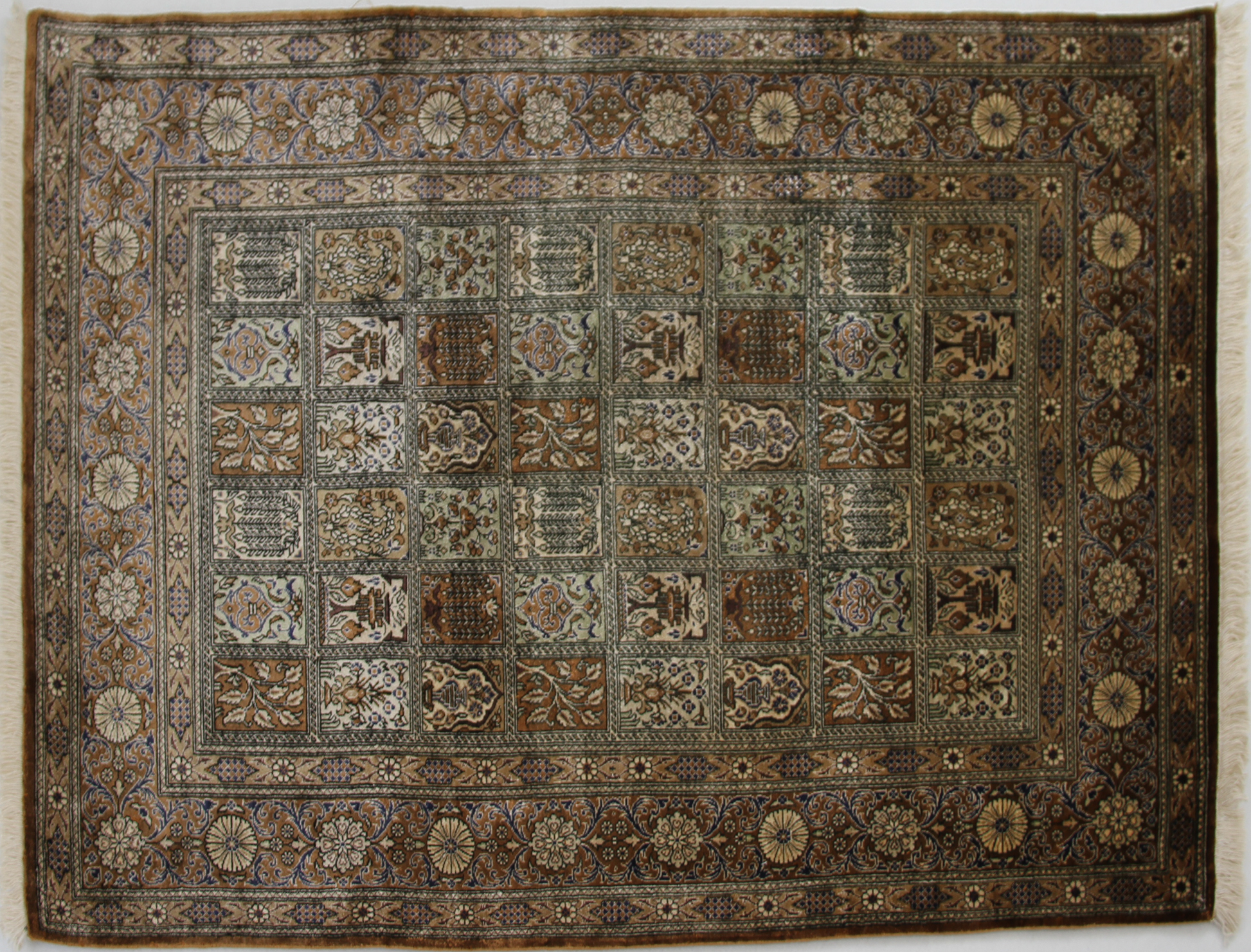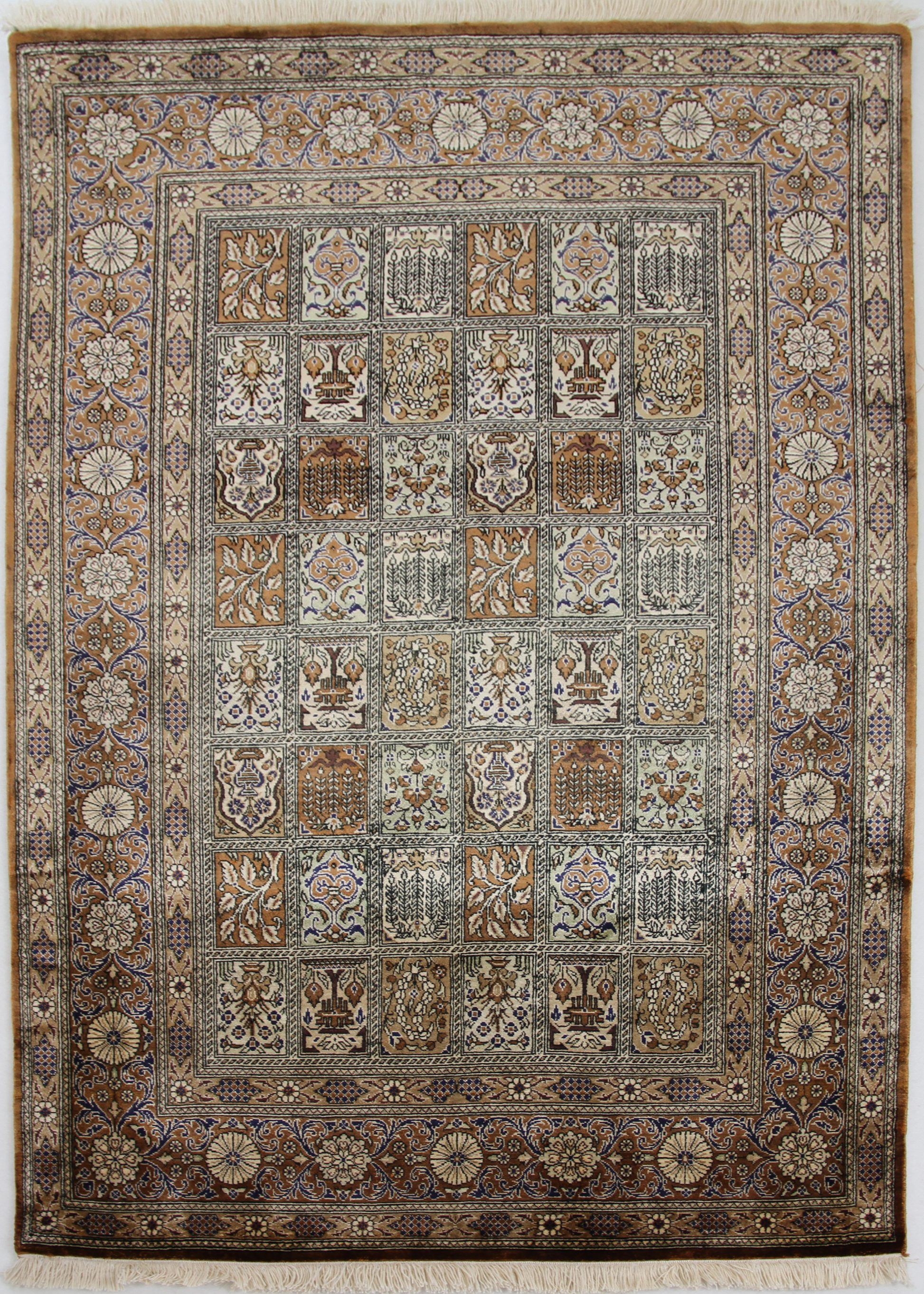 このペルシア絨毯(商品番号: 2157)は、クム産の高級絨毯であり、タイル文様の黄土色デザインが特徴です。独特のパターンと色使いが、ペルシアの伝統的な絨毯の美しさを象徴しています。