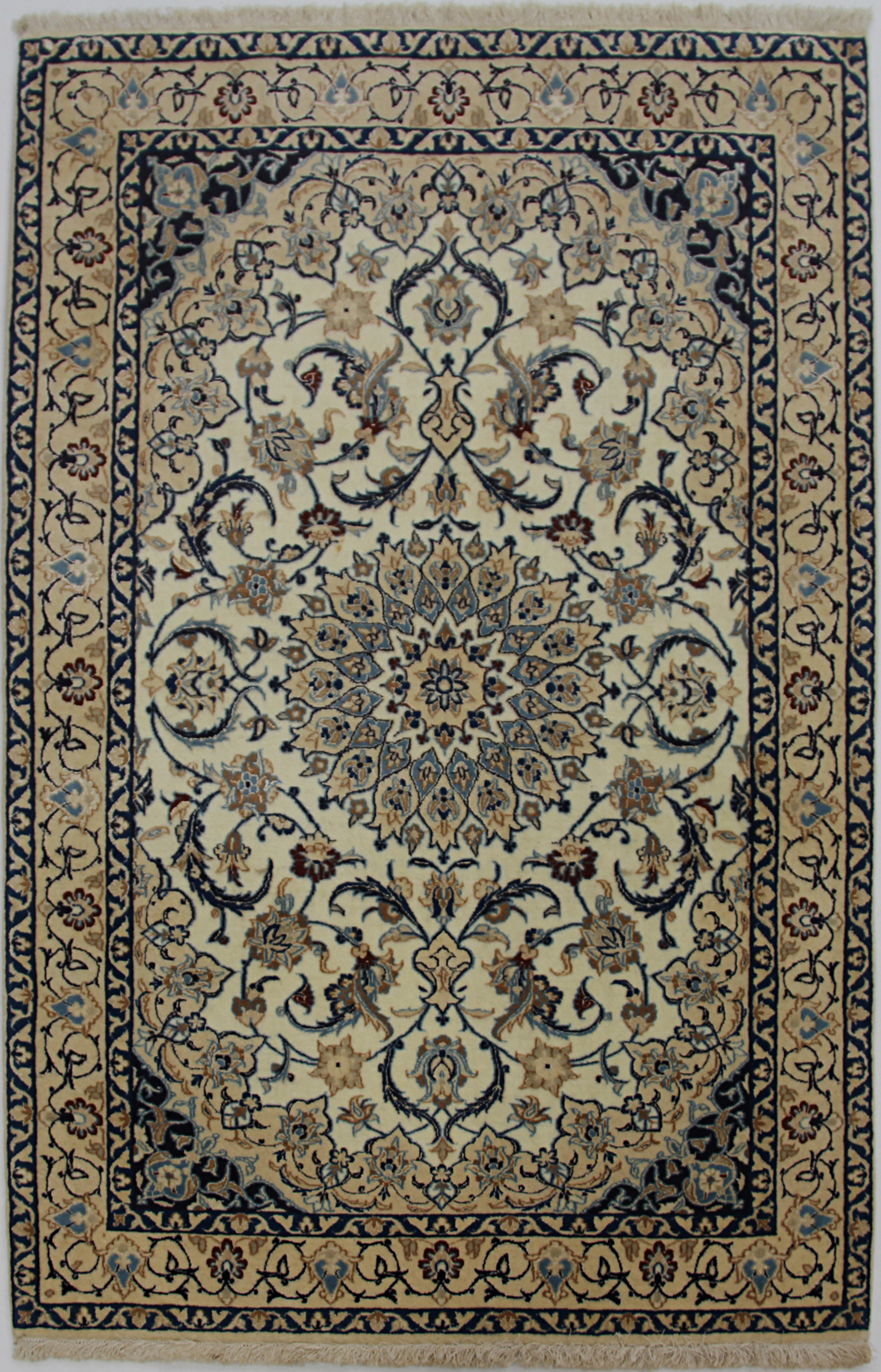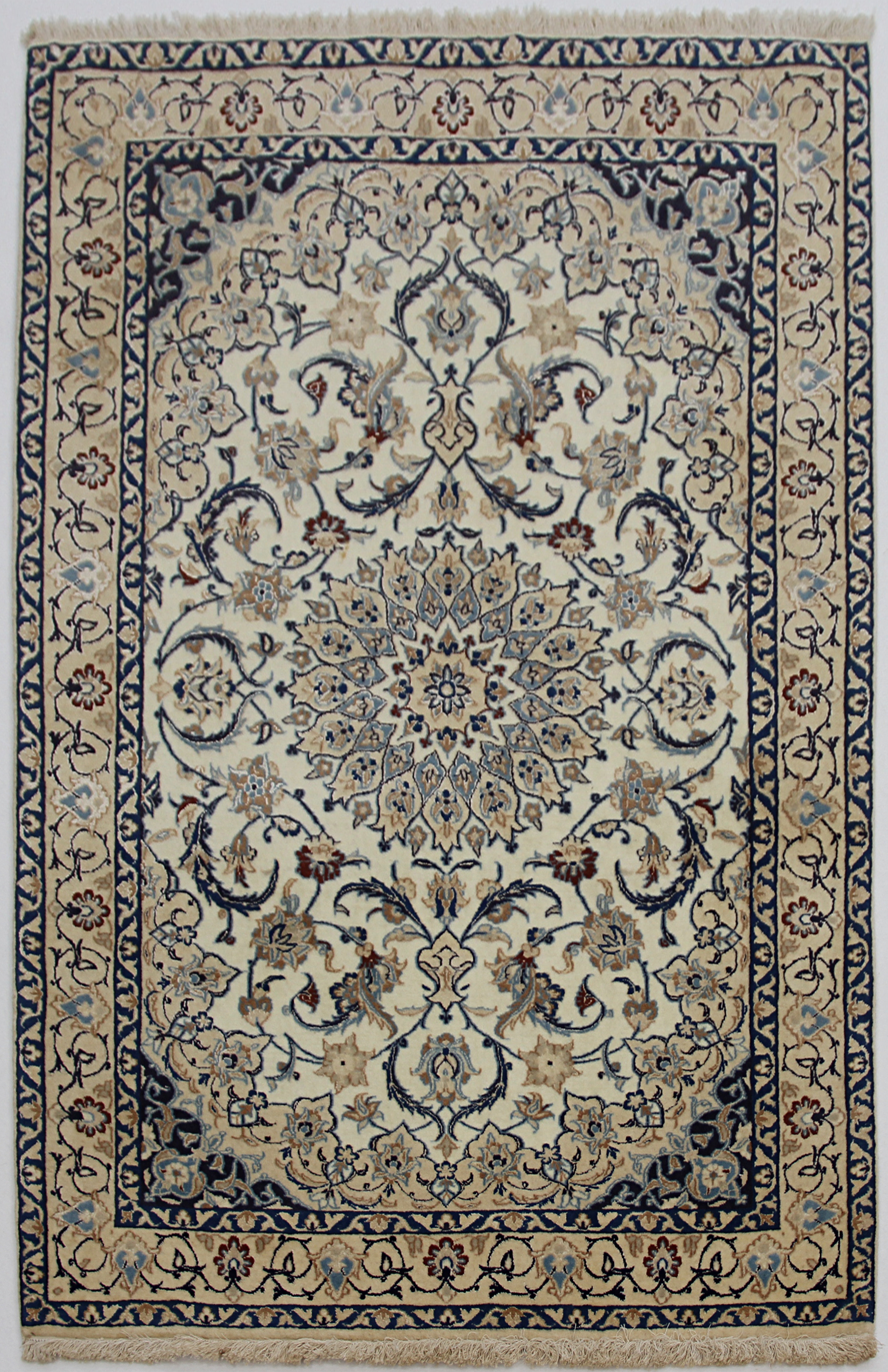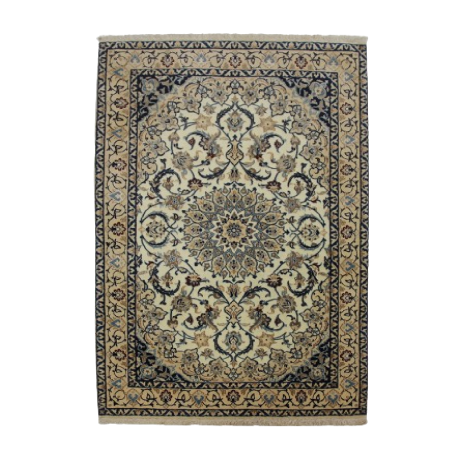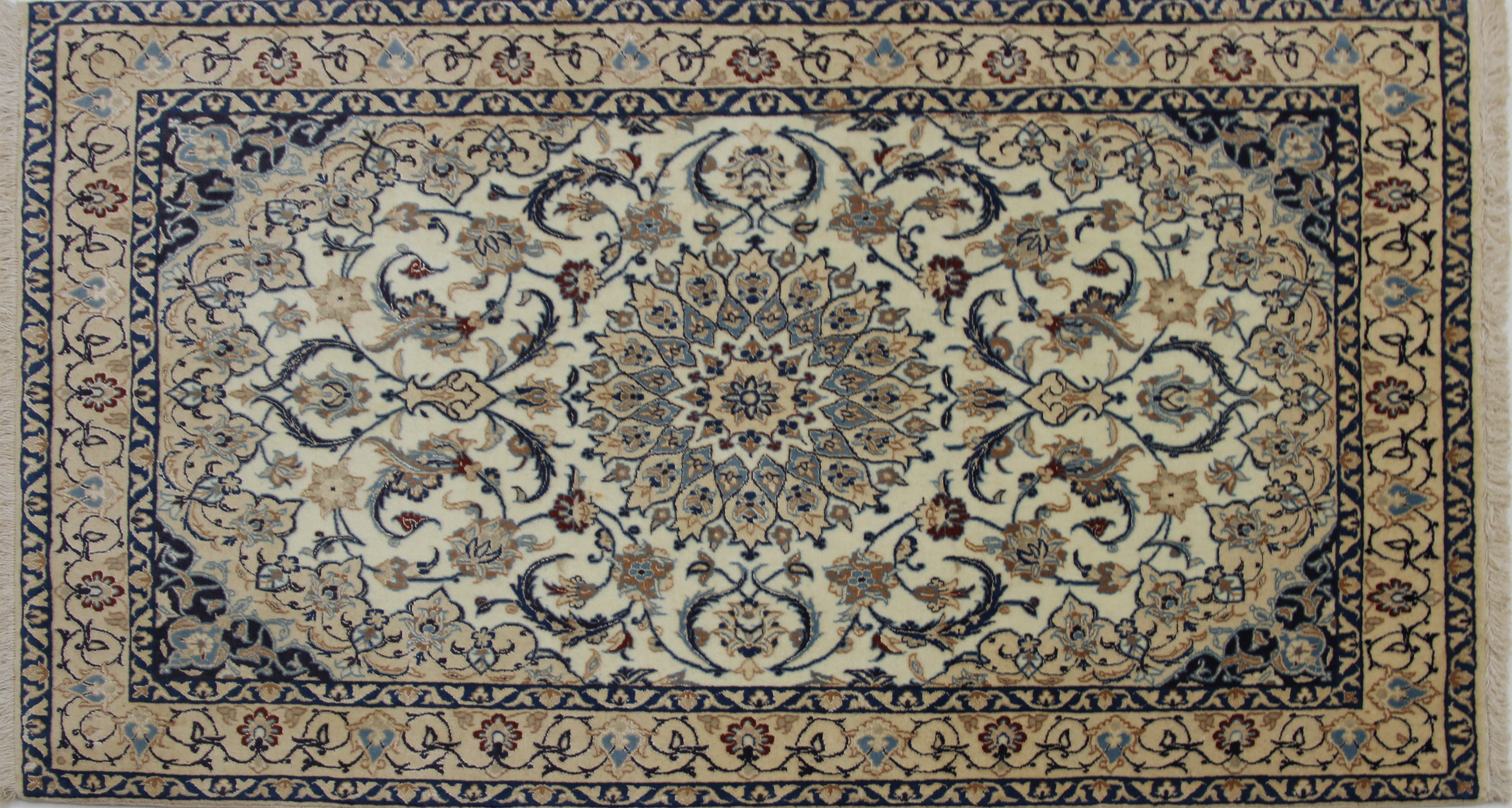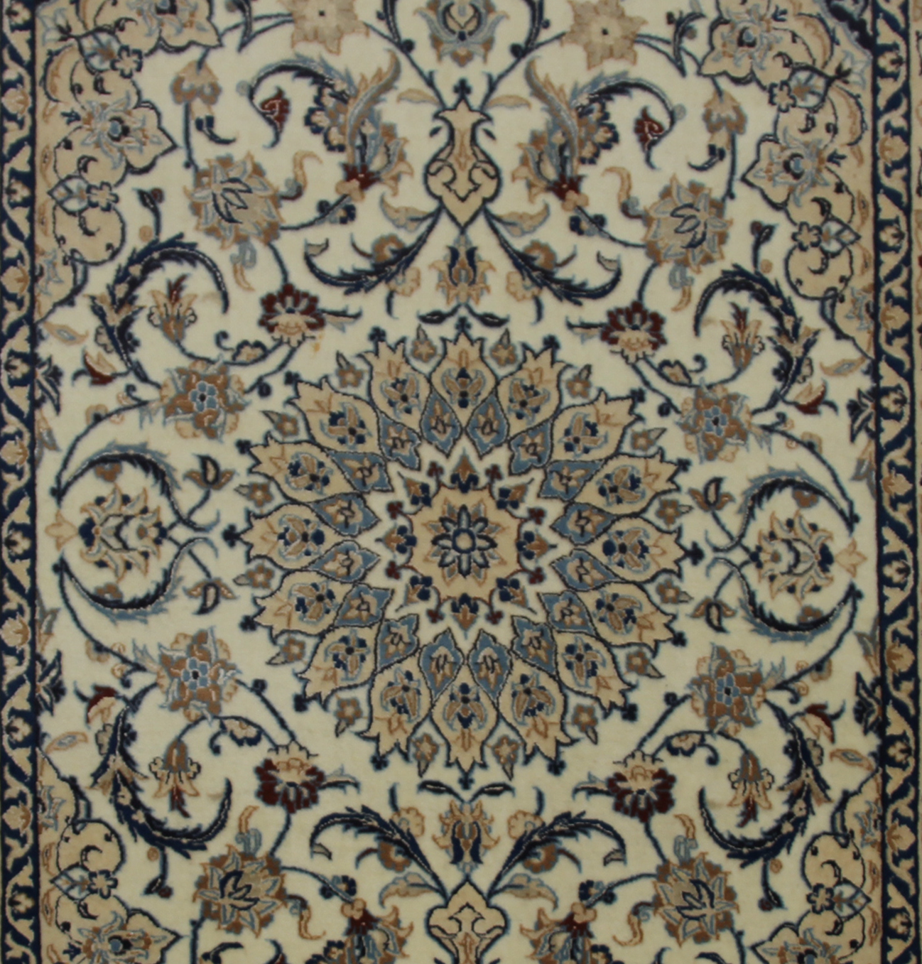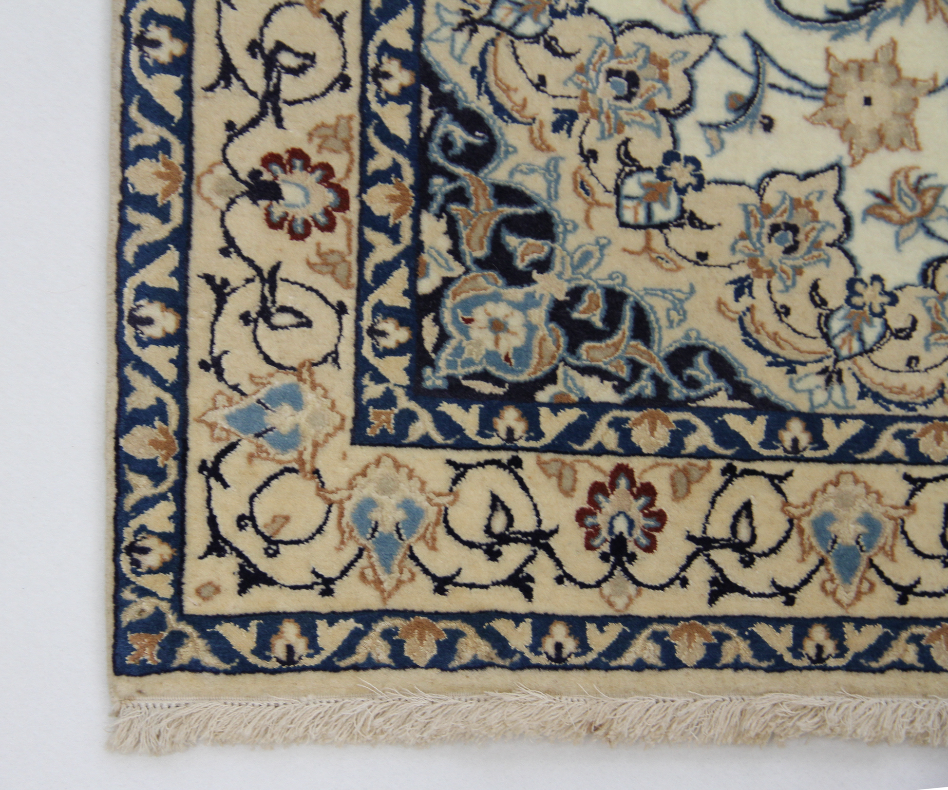 このペルシア絨毯(商品番号: 32)は、ナイン産の高級絨毯であり、メダリオンコーナーのベージュブルーデザインが特徴です。繊細なパターンと洗練された色使いが、ペルシアの伝統的な絨毯の美しさを象徴しています。