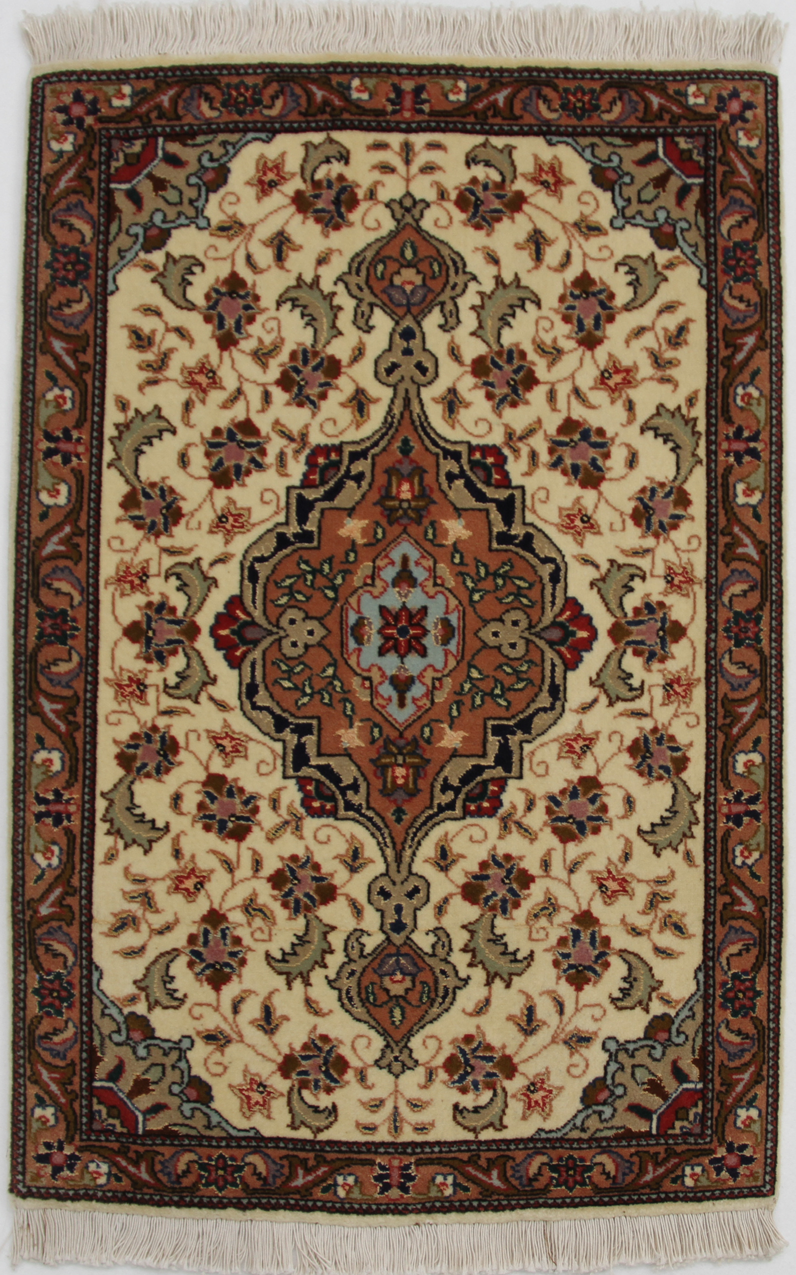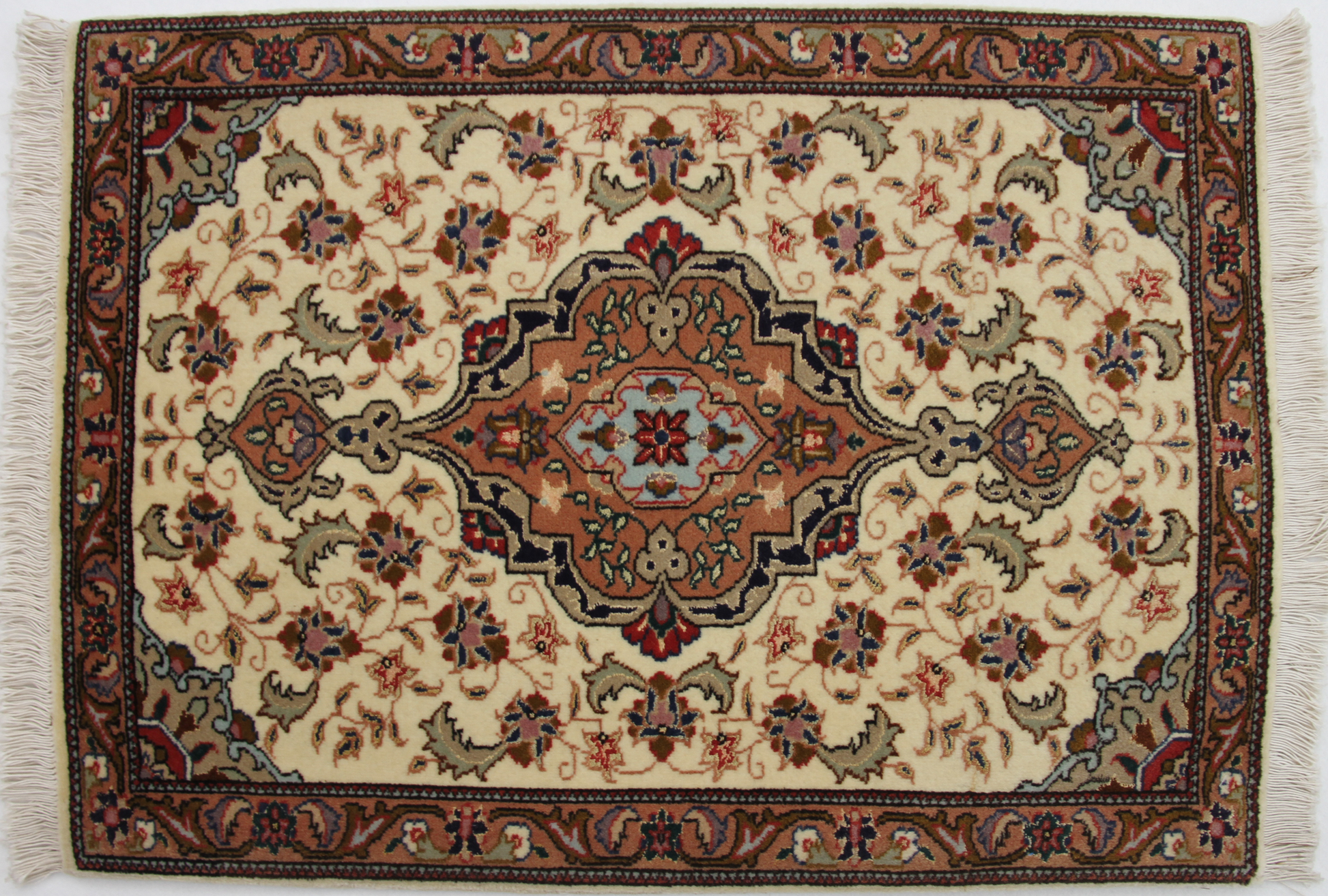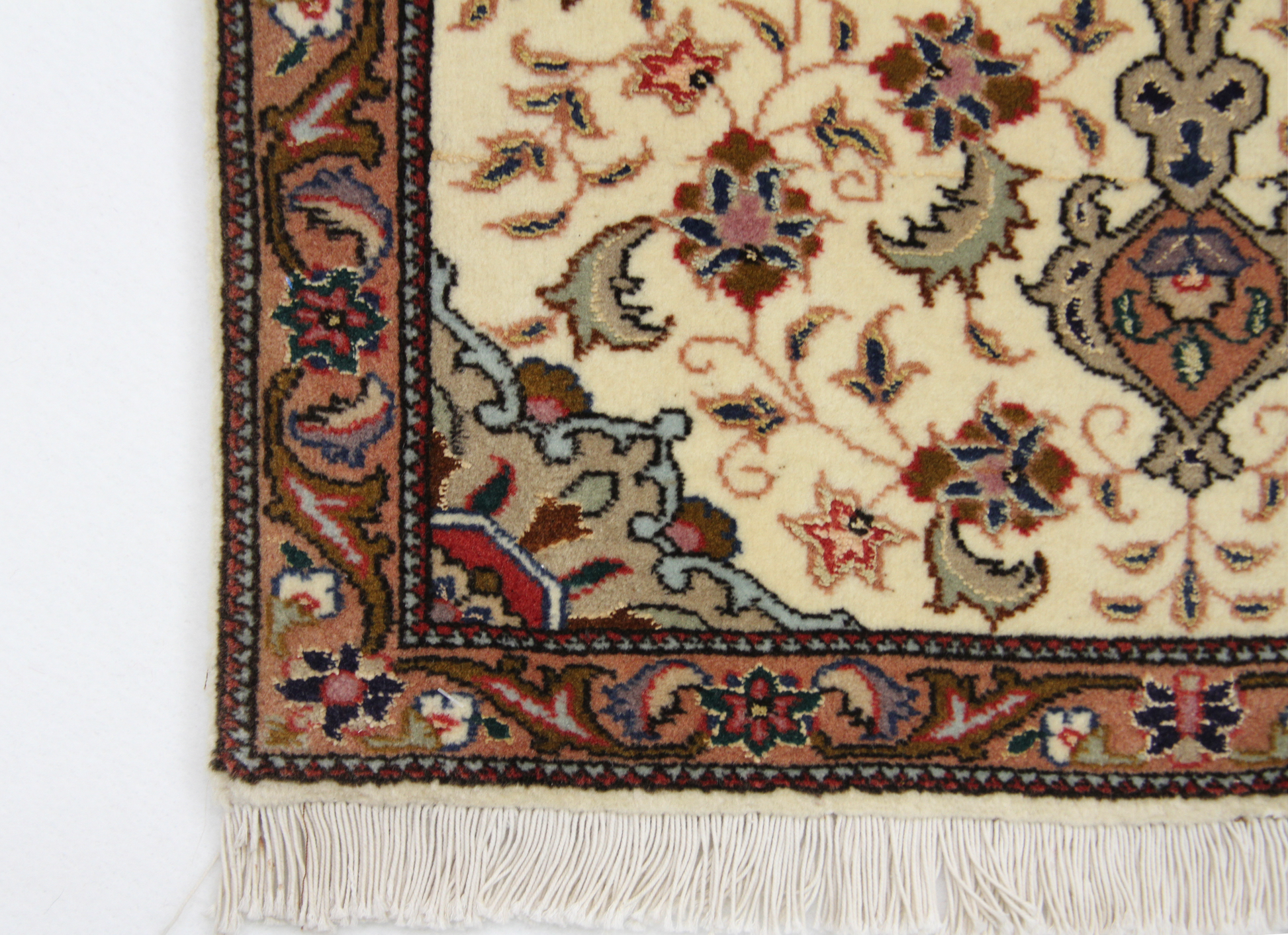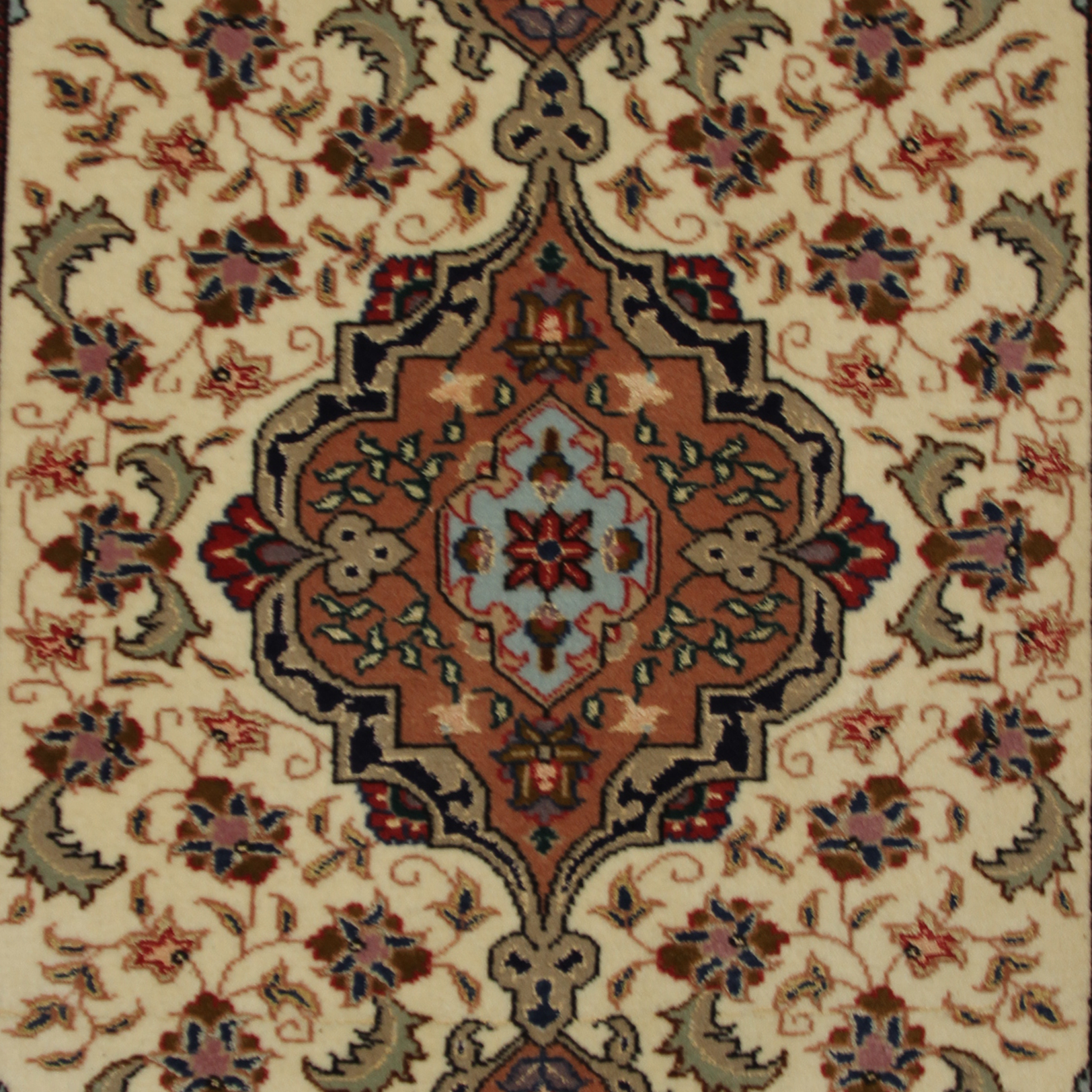 すべてのタブリーズ産ペルシャ絨毯は、熟練した職人によって手織りされています。この絨毯も例外ではなく、高品質のウールを使用して手織りされています。手作業によって生み出される繊細な織り模様が、絨毯に豊かなテクスチャーと優雅さを与えています。